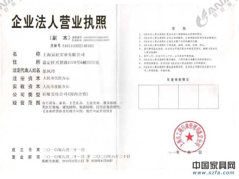 證書介紹 上海冠好家具公司的營業(yè)執(zhí)照。 證書圖片 |