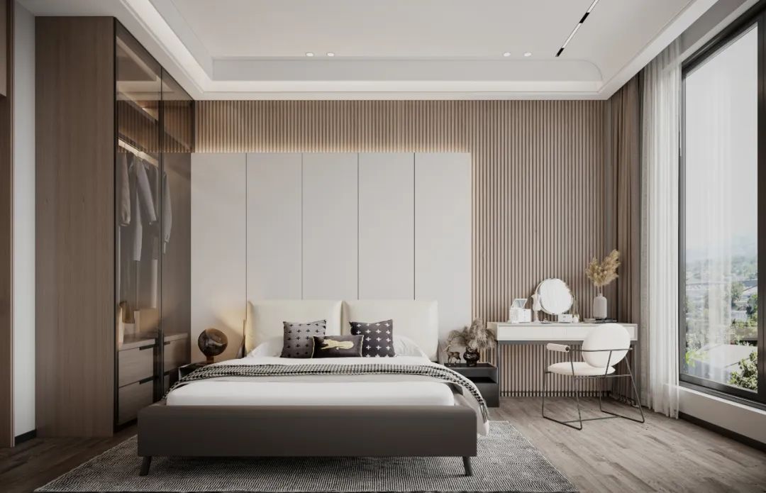 木格柵+大理石背景墻設計,暗設線燈,鋪就出靈動雅致的自然質感。定制簡約衣柜、梳妝臺,豐富空間功能。CBD家居·白金 | BS083軟床,獨立米色軟包挺括飽滿,與整體氛圍呼應,更顯恬淡從容的秩序美。