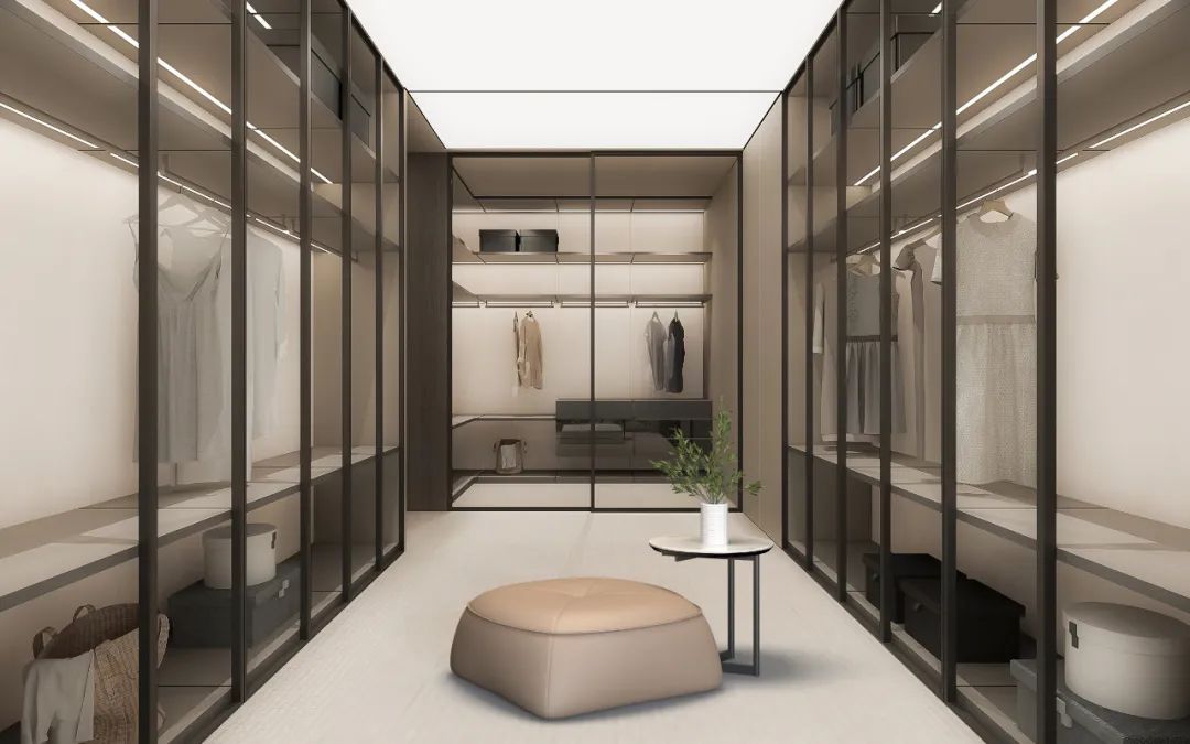 延續主臥的淡雅色調,淺茶褐色的衣帽間更具精致感,三面衣柜設計滿足收納需求,衣物合理懸掛分區,更顯秩序美感,便捷實用,給居主優雅生活。