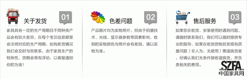| 【主材料】 | 1.產品主框架均采用實木,其他結構包含部分復合板材; 2.所有板材都經過消甲醛處理,板材甲醛釋放量均優于環保水平,保證了家具的環保安全和無污染; 3.世界一流涂裝工藝,各項指標均符合GB18581-2001的標準要求,符合人體健康和環保的時代要求; 4.知名品牌五金件,長久使用不變形. |