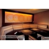 會客空間的室內設計,在設計手法上強調墻面的處理和地面的裝飾,在木磚裝飾的墻面上,掛有裝飾畫及綠色植物進行點綴。沙發的面料與地毯的色調和圖案相似,風格統一。角部的室內燈光照明突出了室內功能。