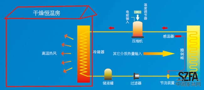 高溫熱泵烘干機組,主要有翅片式蒸發(fā)器(外機)、壓縮機、翅片冷凝器(內機)和膨脹閥四部分組成,通過讓工質不斷完成蒸發(fā)(吸取室外環(huán)境中的熱量)→壓縮→冷凝(在室內烘干房中放出熱量)→節(jié)流→再蒸發(fā)的熱力循環(huán)過程,從而將外部低溫環(huán)境里的熱量轉移到烘干房中,冷媒在壓縮機的作用下在系統內循環(huán)流動。它在壓縮機內完成氣態(tài)的升壓升溫過程(溫度高達100℃),它進入內機釋放出高溫熱量加熱烘干房內空氣,同時自己被冷卻并轉化為流液態(tài),當它運行到外機后,液態(tài)迅速吸熱蒸發(fā)再次轉化為氣態(tài),同時溫度可下降至-20℃~-30℃,這時吸熱器周邊的空氣就會源源不斷地將熱量傳遞給冷媒。