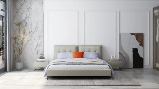 軟床體塊感分明,靠背形如積木拼接,簡約而設計感十足,內里柔軟填充,靠享舒適;淺邊內嵌床尾,極簡流暢,賦予空間輕盈感。