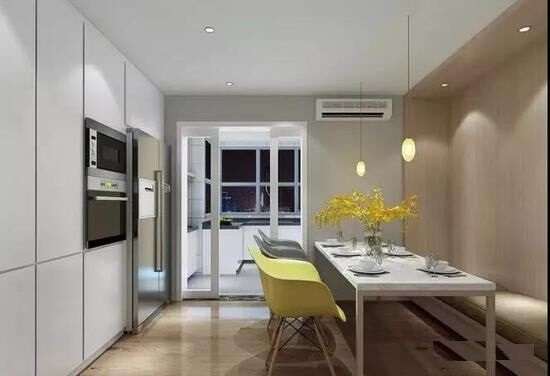 做了造型的白色隱形柜,完全變成背景墻,將餐廳和廚房的雜物隱于無形。