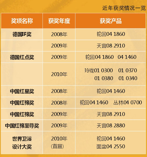 2010年3月初,安蒙衛浴再一次成為了行業的焦點,安蒙衛浴“玲瓏”系列四款產品同時榮獲德國紅點大獎。而這一切都出自中國的原創設計,見證了民族品牌在世界設計領域的崛起,向世人昭示國內衛浴行業蓬勃的創新力量與發展遠景。