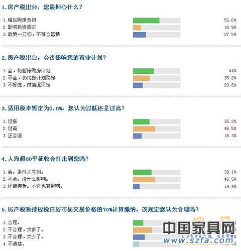 對(duì)于房產(chǎn)稅的出臺(tái),消費(fèi)者也有自己的看法。在搜房網(wǎng)的專項(xiàng)網(wǎng)絡(luò)調(diào)查中顯示,55.9%的網(wǎng)友擔(dān)心房產(chǎn)稅會(huì)進(jìn)一步增加購(gòu)房負(fù)擔(dān);有44.8%的網(wǎng)友表示會(huì)影響到置業(yè),暫停購(gòu)房計(jì)劃。有近一半的網(wǎng)友認(rèn)為0.6%的稅率偏高,45.5%的網(wǎng)友認(rèn)為人均60平米的征收面積不會(huì)影響到購(gòu)房的意愿。