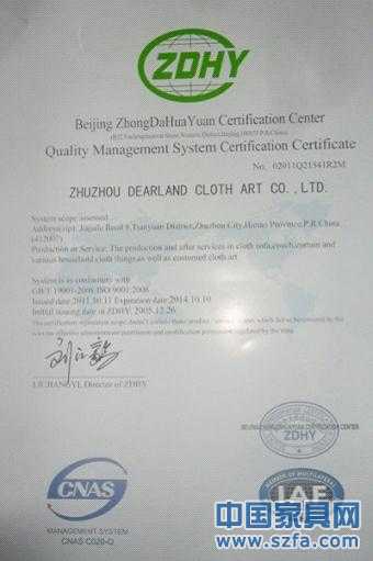 通過ISO9001質量管理體系認證是蝶依斕家居永恒的主題,質量是一個品牌發展壯大的關鍵,在逐步完善質量體系的進程中,經過長時間的準備,2000年伊始,蝶依斕家居就申請了——ISO9000國際質量體系認證,此次認證邀請的是國內最權威的北就中大華遠認證中心作為蝶依斕質量體系的審核單位,認證的范圍包括蝶依斕家居布藝沙發,布藝窗簾,布藝床及其它布藝有品的生產和售后服務。在本次考核過程中,認證中心專家對蝶依斕家居產品的研發、生產、檢驗等每個環節進行了認真、仔細的檢查,對產品標準、生產流程、工藝文件、原材物料管理制度等進行了嚴格的檢查考核,此外,專家們還對蝶依斕公司質量管理制度貫徹執行情況進行了檢查考核,所有檢驗、考核都順利通過。