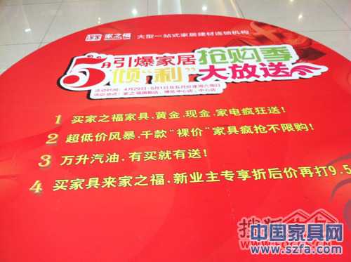 除了這兩家賣場以外,包括紅星美凱龍香蜜湖店,博耐家居等深圳多家賣場均在五一前夕就打出了“給力促銷”,“賣場家具節”等標語,成為節假日另外一道風景線。