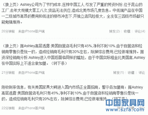 剛收到信息,有關美國家具大鱷進入國內市場正全面招商,警示各加盟商:據(jù)Ashley高層透露:美國自營店毛利只有45%,凈利不到10%,由于自營店和經銷商零售價是統(tǒng)一的,造成經銷商毛利只有20%左右,除掉綜合費用,已經很難維持。