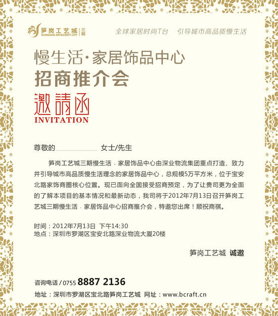 筍崗工藝城三期慢生活﹒家居飾品中心由深業物流集團重點打造、致力并引導城市高品質慢生活理念的家居飾品中心,總規模5萬平方米,位于寶安北路家飾商圈核心位置。現已面向全國接受招商預定,為了讓貴單位更為全面的了解本項目的基本情況和最新動態,我司擬于2012年7月13日召開筍崗工藝城三期慢生活﹒家居飾品中心招商推介會,特邀您在百忙之中出席!順祝商祺。