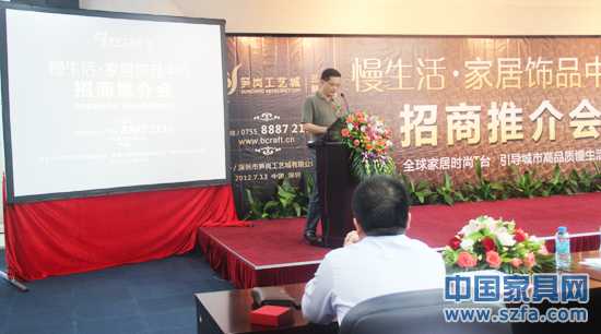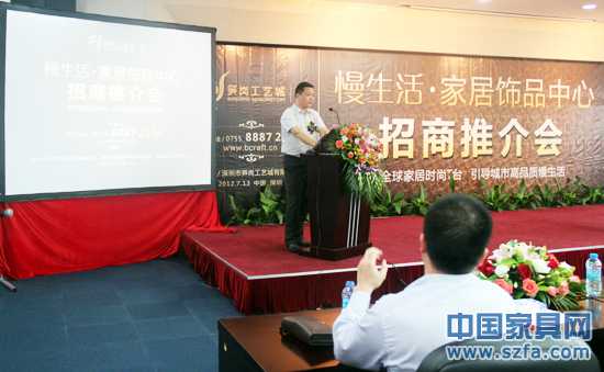 筍崗工藝城三期慢生活•家居飾品中心招商推介會于7月13日在深業物流集團大廈20樓成功舉辦。深圳市工藝禮品行業協會秘書長吳雅琴、深業物流集團副總裁付德梅、深圳市筍崗工藝城有限公司總經理劉學明等領導出席。此外,筍崗工藝城公司長期戰略采購合作單位代表:寶能地產股份有限公司、寶能酒店投資有限公司以及金融服務合作商深圳市粵商小額貸款有限公司等代表也參加了推介會。筍崗工藝城總經理助理姚春現場為來賓精彩分析了家飾行業的未來發展趨勢,并闡釋了項目的經營理念以及最新動態,現場活動氣氛熱烈,不少人對筍崗工藝城所打造的倡導慢生活理念的家居飾品中心表示高度認可,表示非常期待筍崗工藝城三期能夠盡早開門迎客,現場200多名意向客戶爭相咨詢選鋪。
