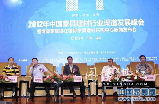 8月8日,2012年中國家具建材行業渠道發展峰會在湛江舉行。 此次峰會由廣東省家具商會、湛江市裝飾協會和博皇家居集團共同主辦,其主題是探索?合作?發展。來自省內外的專家、行業協會有關負責人、商家等齊聚一堂,共論家具行業發展現狀及走勢,預測未來走向,相互交流應對策略。