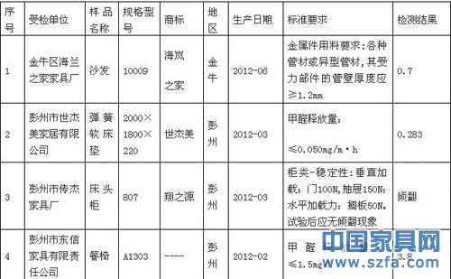 此外,有2批次的軟體家具產(chǎn)品不合格,其中彭州市世杰美家居有限公司的一批次2000×1800×220“世杰美” 彈簧軟床墊(2012-03),檢出甲醛釋放量超標(biāo)。另有1批次的沙發(fā)金屬件用料要求不合格。
