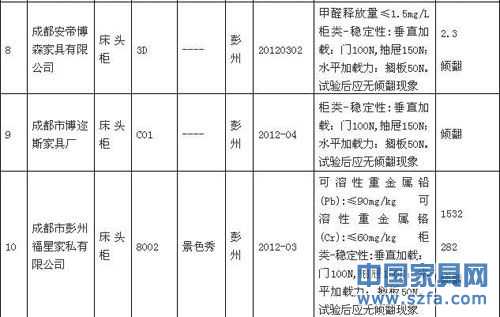 本次抽查中發(fā)現(xiàn),有30批次的木家具產(chǎn)品不合格,其中包括成都安帝博森家具有限公司3D床頭柜、成都紫玉家私有限責(zé)任公司666“紫玉” 床頭柜、成都市華之龍家俱有限公司“華之龍”活動(dòng)柜在內(nèi)的10批次產(chǎn)品甲醛釋放量不合格。另有有25批次產(chǎn)品穩(wěn)定性不合格、3 批次產(chǎn)品抽屜滑道強(qiáng)度不合格、1批次產(chǎn)品可溶性重金屬超標(biāo)。