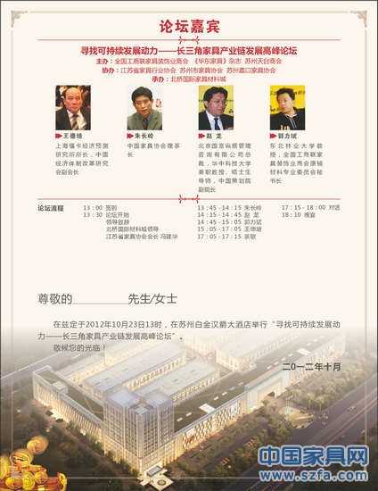 2012年10月23日,由全國工商聯(lián)家具裝飾業(yè)商會、《華東家具》雜志、蘇州天臺商會主辦,江蘇省家具行業(yè)協(xié)會、蘇州市家具協(xié)會、蠡口家具協(xié)會協(xié)辦,北橋國際家具材料城承辦的“尋找可持續(xù)發(fā)展動力——長三角家具產(chǎn)業(yè)鏈發(fā)展高峰論壇”將在蘇州白金漢爵大酒店盛大舉行。此次論壇旨在探討長三角地區(qū)家具行業(yè)整個產(chǎn)業(yè)鏈的可持續(xù)發(fā)展問題。