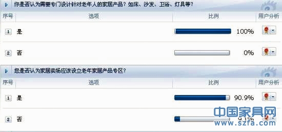 重陽節(jié)前夕,新浪家居聯(lián)合參考消息北京參考做了一份有關(guān)老年家居市場調(diào)查的網(wǎng)絡(luò)調(diào)查。其中一項關(guān)于“你是否認為需要專門設(shè)計針對老年人的家居產(chǎn)品?如床、沙發(fā)、衛(wèi)浴、燈具等”的調(diào)查中,100﹪的網(wǎng)友表示需要。在另一項關(guān)于家居賣場是否該設(shè)立老年家居產(chǎn)品專區(qū)的調(diào)查中,90.9﹪的網(wǎng)友選擇了是。可見,老年家居包括老年家具在內(nèi)的消費訴求很高。 新浪家居聯(lián)合參考消息北京參考有關(guān)老年家居市場調(diào)查部分調(diào)查結(jié)果