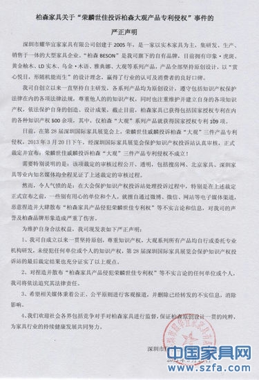 隨后,深圳家具展的第三天,3月21日,柏森家具就發表了關于“榮麟世佳投訴柏森大觀產品專利侵權”事件的嚴正聲明。聲明中稱柏森“大觀”系列所有產品均自行或委托專業機構研發,未侵犯任何單位或個人的知識產權。同時聲明也對事件發生過程中,一些別有用心的單位和個人擅自通過微博、微信、網站等電子渠道散播“柏森家具產品侵犯榮麟世佳專利權”等不實言論進行了譴責,強調保留追究法律責任的權力,并要求相關媒體和個人刪除不實報道和信息,以消除影響。另外,柏森還在聲明中表示歡迎社會各界包括競爭對手對柏森家具進行監督。