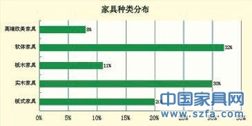 通過走訪浙江嘉興、湖州、杭州三地的9個賣場,經過數據分析得出:賣場家具種類占比中軟體和實木家具占據了大半壁江山,分別為32%和30%。軟體家具由于其色彩以及舒適度上更受年輕一代消費者的喜歡,而實木家具,隨著近幾年實木風的興起,實木家具品牌越來越多,眾多非實木家具企業也紛紛涉水實木家具。板式與板木分別為20%、11%;高端歐美家具8%。就分布而言,實木家具以及高端歐美家具則大都位于賣場的高層。