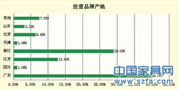 所經營品牌產地情況,其中來自廣東的品牌占比39.78%,浙江本地29.03%,第三位的是江蘇,12.90%。此種情形不只是浙江,在其他地方的賣場也會出現經銷商所代理的品牌廣東占比居多。廣東,素有“中國家具看廣東”,另外由于廣東與國際接軌,潮流更新快,也不乏一些內地的企業注冊廣東的品牌。近幾年,浙江的家具產業也不斷崛起,浙江土地上本土品牌代理多也是很自然的事情。