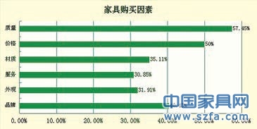 在消費者購買家具首要考慮因素中,質量獨占鰲頭,達到57.45%的比例;其次是價格,占比50%。由此可以看出,價廉物美一直是中國老百姓孜孜不倦的追求。