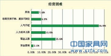 問卷中關于經營中的一些困難, 賣場人氣不旺遙遙領先成為NO.1,達到64.89%。其次是租金上漲,23.4%的比例,人力成本上漲以及廠商支持不夠分別為13.83%和9.57%,資金困難2.13%,由此可見大多經銷商經營過程中都不差錢。不過人力成本上漲是整個社會的現象并不是家具行業的特例。賣場人流量是影響銷售的關鍵因素,但是隨著各種活動的此起彼伏,也并非所有的活動都奏效。