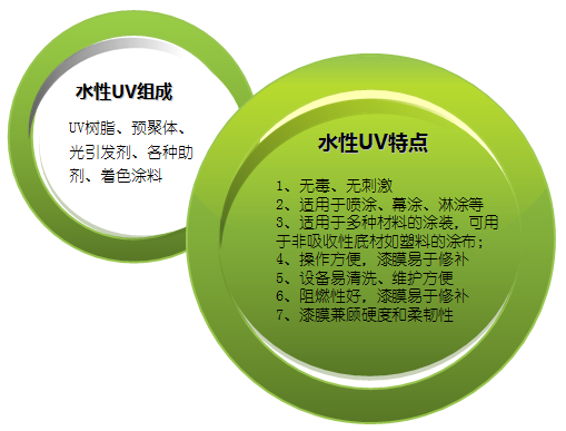 水性UV兼具UV及水性涂料的優點,它既能達到水性漆的環保,同時也能UV快速成膜。近些年來快速成長,特別是在歐美國家,已經在家具廠普遍的使用。