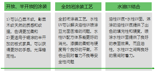 水性UV漆在使用方式上更加靈活,可以適用于噴涂、幕涂、淋涂等,與傳統油性UV相比,可以兼顧硬度和柔韌性。具體特點如圖所示: