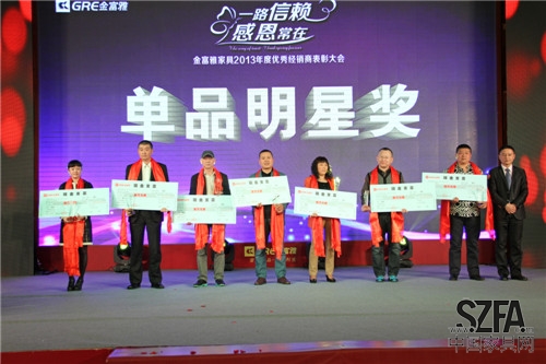 12年以來,他們一直只專注經營金富雅旗下品牌,銷售業績突出,伴隨金富雅一起成長,他們是金富雅最可敬的人!來自馬鞍山的唐振華、西安的夏君、盤錦的徐先鋒榮獲第七項大獎,2013年度“最佳忠誠獎”。