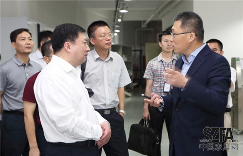 坪山新區領導劉勝副主任(左)、吳德林主任(中)在侯克鵬會長(右)陪同下考察深家協家具研發部