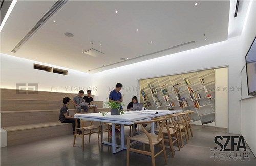 會議室設置了幾段大臺階,可用于內部的例會和設計培訓,80厘米寬的臺階也可以當做床鋪午睡休息。關于設計創意,李益中先生解釋說:“我上一家公司,開會時候大家就紛紛忙于搬椅子,搬來搬去很不方便。所以我在這里借鑒了大學的階梯教室,來解決這個問題。傾斜書架,不僅僅是為了好看——利用重力讓書本自動排好,可以節約管理成本。”