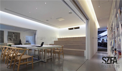 會議室設置了兩道手推拉門,開會的時候,將兩道門封閉,這里就成為一個安靜秘密的空間;沒有會議的時候,兩道門可以完全打開,會議室的空間完全融入到休息等候區,乃至延伸到后面的走廊書架,空間就開闊了。
