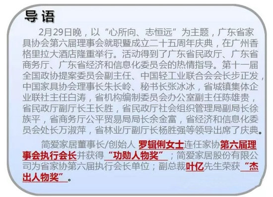 廣東省家具協會第六屆理事會就職暨成立二十五周年慶典是2016年家具行業的首場盛會。對于羅輯俐董事長而言這更是開年與好朋友的一次聚會。