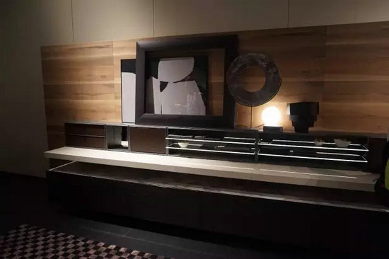 Poliform也在本屆展會(huì)推出了它的新品廳柜系列,護(hù)墻板與墻體無縫貼合,充滿各式功能的柜體單元懸掛其上。