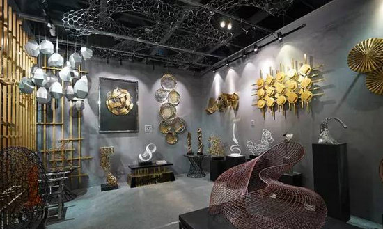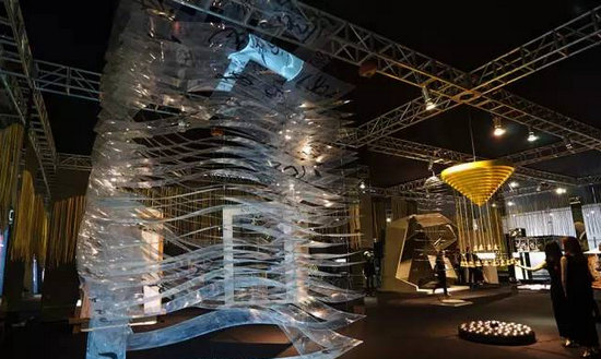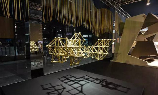 在“心+設計學社”展位里,擺放著12位設計師各自帶著對東方文化的理解和感悟而制作而成的充滿東方美學與中國文化的展品。圖中是邱春瑞大師以點線為基礎設計而成的作品,通過視覺轉換呈現出不一樣的空間效果,搭建成一個充滿生命變化,時間變化的空間。