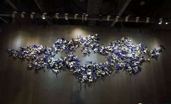 在不同的環境中,藝術裝置能表現出不一樣的形態特點。這面蝴蝶墻,用藍白二色的蝴蝶堆砌出形狀,看似隨意,但其實是設計師煞費苦心制作的。燈光亮起,金屬蝴蝶折射出迷人的光線,吸引眾多現場觀眾。