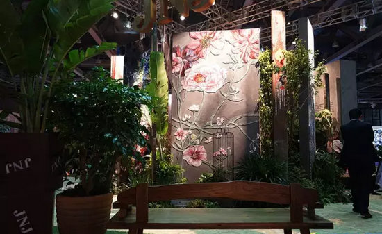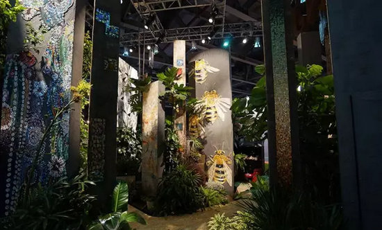 通過與不同元素的搭配,綠植也能襯托出不同的主題。JNJ馬賽克品牌主管潘小姐介紹,他們今年的布展主題是“工匠精神”,用馬賽克鑲嵌的手法呈現出一幅美輪美奐的森林景觀,向大眾表現出不拘形式,不拘材料的馬賽克鑲嵌工藝的無限可能性,同時,也是對今年紅棉獎工匠精神致敬。