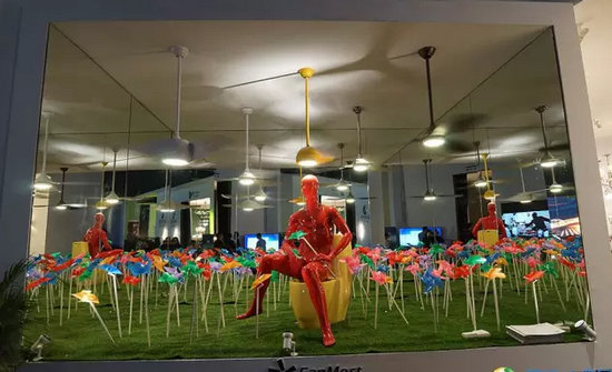 只要巧妙布置,在有限的空間中,色彩與空間展示就能碰撞出別樣的火花。在Fanmost展位里,一個色彩繽紛的波普風藝術裝置特別惹人注目,數十個彩色風箏被安置于草坪上,且巧妙地利用了玻璃的折射面,營造出寬敞的視覺效果。