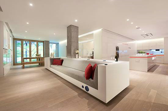 墻體上的可伸縮裝置緩緩推出的高清電視機,地板上隨機擺放的小圓形布藝沙發,海福樂獨特設計的不占空間又能隨時取用酒杯、紅酒等的小小吧柜,融合LOOX家居照明系統和專屬嵌入式藍牙播放音響系統的極致運用,幽暗優美的環境里盡情享受一場來自視覺和聽覺的雙重盛宴,家庭影院的舒心享受盡在指間。