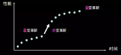 革新按照其性能變化的激烈程度而言,有量變革新與質變革新,質變革新通常是在量變到一定程度后的跳躍,而不是說變就變的,圖1為量變與質變在性能與時間上的關系函數,這是技術驅動革新可遵循的基本規律。