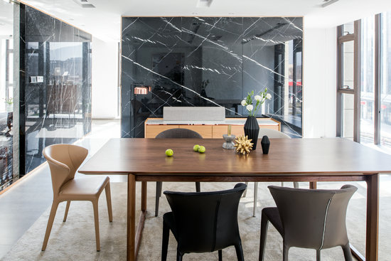 展廳總共一千多平方米,分為兩層。底層主要承擔空間展示的功能,劃分成10個依照功能而劃分的區域;邀請杭州室內設計團隊“余論設計”進行空間設計,建筑內部工業感十足;黑白雙色大理石的大面積采用,集簡約線條與奢華質感于一身,為展廳奠定大氣的主調;半敞開的空間設計,方便參觀,又具備所有家居元素。