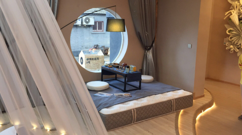 一進門的墻面裝置藝術”繁榮時代“由KINGKOIL美國金可兒聯合法國著名設計師Paloma Bouteleux創作,該作品選用了金可兒床墊生產過程中所使用的原材料,包括高品質海綿、彈簧、軟氈與硬氈制作而成。作品希望用友好而親切的感官刺激,解構你身下的“親密愛人”,由此喚醒,每個人對民宿睡眠質量的重視。
