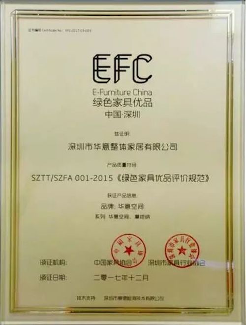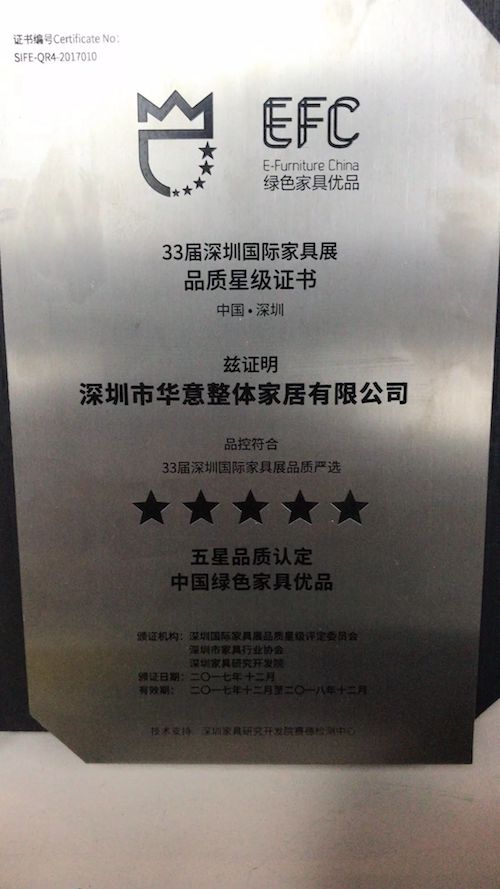 今年年初,華意空間正式申請第三批“中國綠色家具優品”企業,并成為第三批準入資格企業之一;如今,華意空間正式收獲“中國綠色家具優品”證書,以及獲得首批參展商“品質星級評定”五星品質認證,可謂“雙喜臨門”,也代表了華意空間的品質率先得到深圳家協、專業檢測機構及行業的廣泛認可。