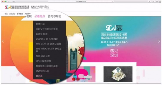 方式2:或者進入深圳國際家具展官網,點擊目錄欄“必看亮點”下拉菜單“金汐獎”進入報名頁面。