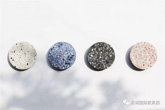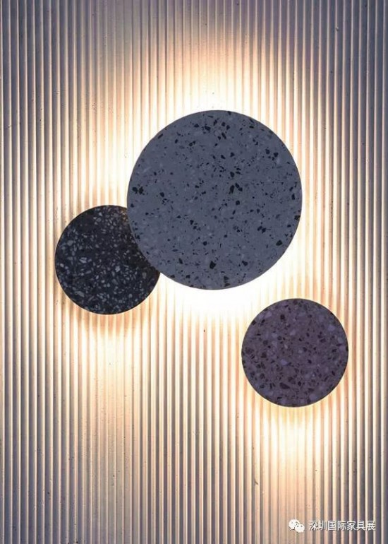 水磨石作為建筑表皮材料歷史由來已久,而延伸到照明燈具燈罩部件的應用卻甚少。水磨石本身就具備耐水耐污的戶外材料需求,其亮燈時,水磨石的存在即消隱,LED燈源在亞克力底座的反射作用下形成灼燒的光環;熄燈時,水磨石燈罩成為墻上層次交錯的立體裝置。兩個尺寸的水磨石圓形燈罩與豐富的色彩肌理適合多種空間氣質的搭配。