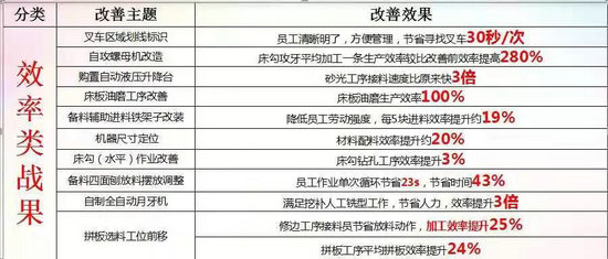2、9大項目成果:可視化、員工多技能考核培訓、修邊余料重新利用、修邊拼板流水線建立、新品質用料標準制定、團隊士氣項目、班組長考核、膠水成本下降、木材利用率提升;