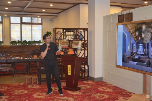龍順成銷售部長胡文杰為大家介紹龍順成京作非遺文化園、家具博物館。