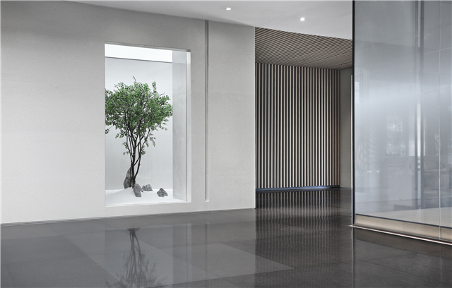 另一側的引景入室,設計師為來訪者創造的一場生命感的邂逅。被設定的天空產生的光和影,與彼時靈動線條、禪心明月,樹影斑駁交相輝映,平增一份雅趣。