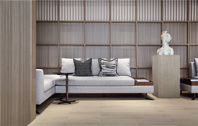 元素的選用,是體現整個方案的初始。模型區一改往常的繁華,選用繁密且律動成韻的木格柵,每一條橫平豎直的天花線條,最大程度上聯系了人與自然,獨立又相融。