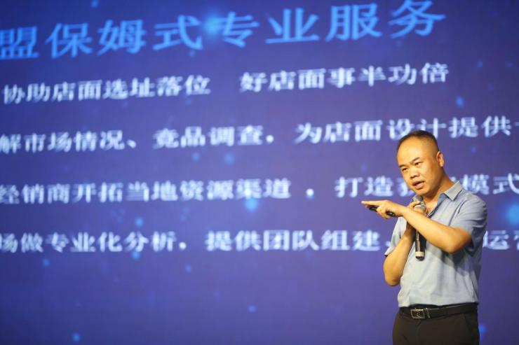 他給出八大保障系統,確保經銷商開店無憂,分別是:招商加盟、建店系統、培訓系統、運營幫扶系統、品牌營銷系統、新零售系統、產品研發設計、客戶服務系統。
