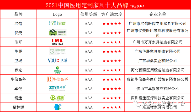 招投標供應鏈品牌推介平臺為推動醫用定制家具企業加強品牌建設,提升品牌的知名度和美譽度,擴大醫用定制家具品牌在招投標市場和消費市場的影響力,特舉辦了“2021中國辦公及商用家具評價推介”活動,據悉,此活動受到業內及社會各界人士的廣泛關注和熱情參與,宣傳展示家具知名品牌企業510余家,網絡公眾滿意度市場調查投票共達829.3262萬余票。各企業數據由機構推薦、企業自薦、大數據采集構成,并由來自質檢、環保、認證、行業協會等專家對各品牌進行了綜合評審,在全國家具行業中甄選出誠信、優質、綠色、環保、服務能力強、綜合實力突出的“2021中國醫用定制家具十大品牌”供應商,展現了企業良好品牌形象,充分發揮品牌引領作用,為廣大消費者、采購單位、經銷商、代理商等各方提供參考。具體如下: